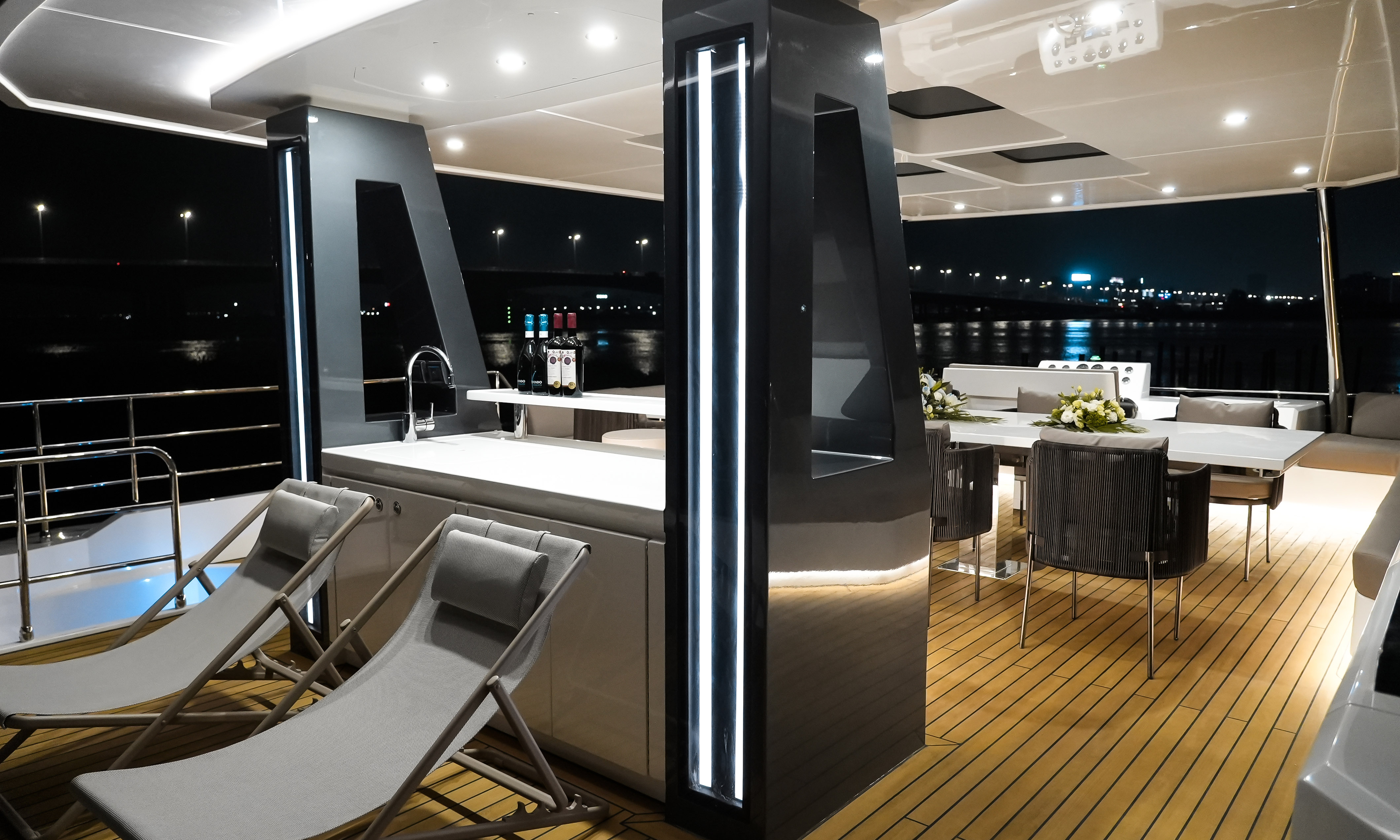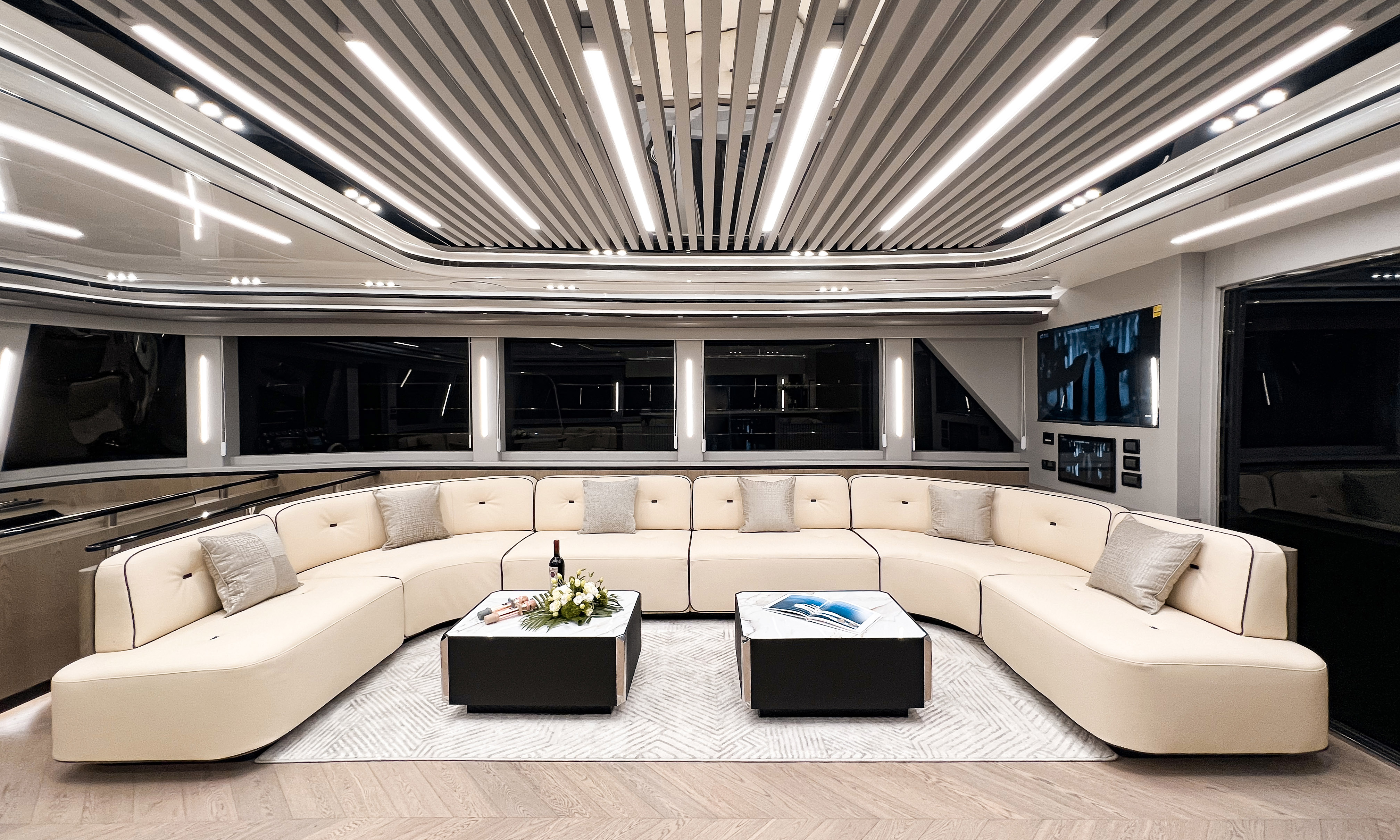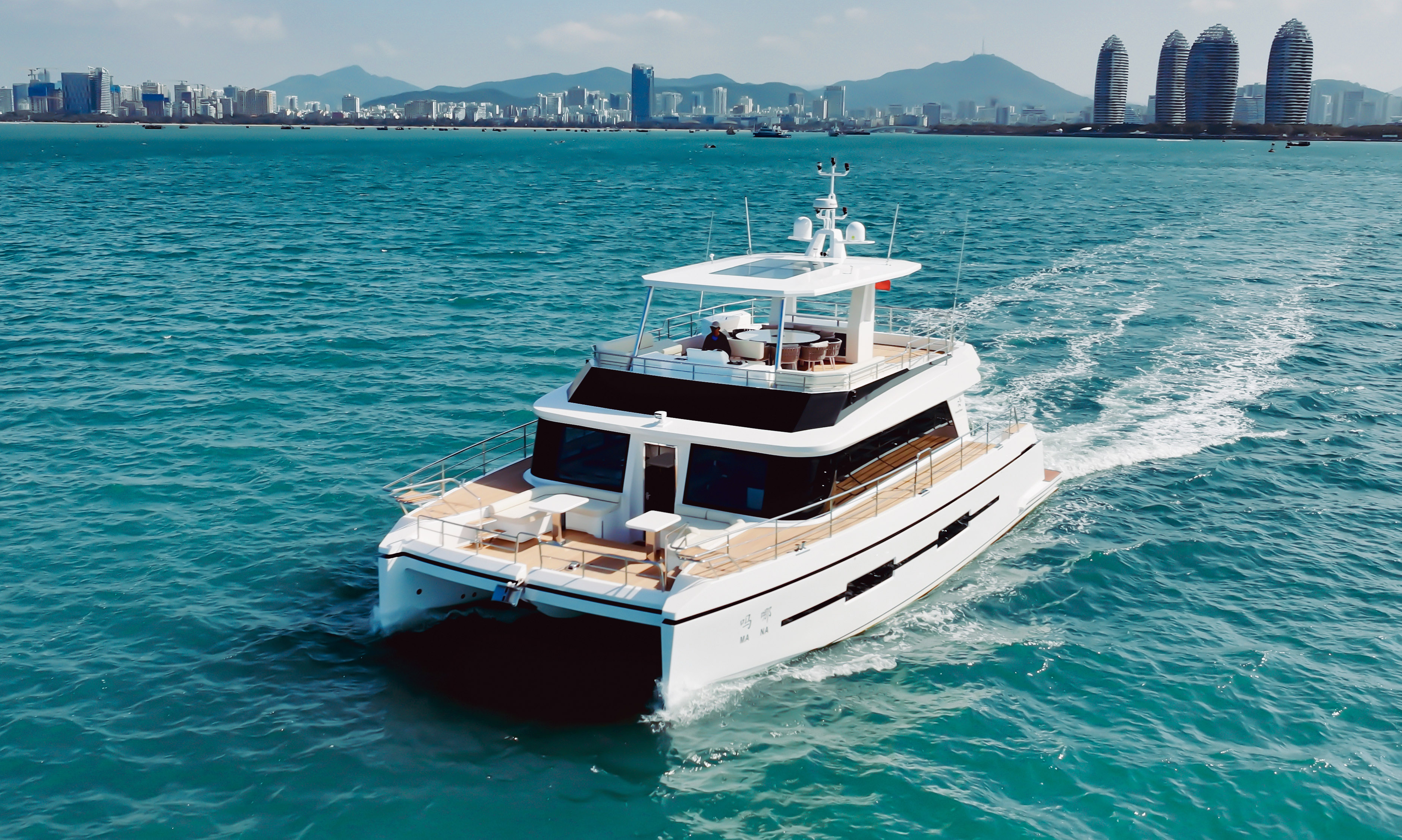 時尚硬朗的戰(zhàn)斧外形,沉穩(wěn)凌厲的垂直船艏,剛勁有力的線條融入船身輪廓,巨型長條舷窗加持,TY560雙體動力商務(wù)游艇以霸氣之軀穿梭于海平面之間。