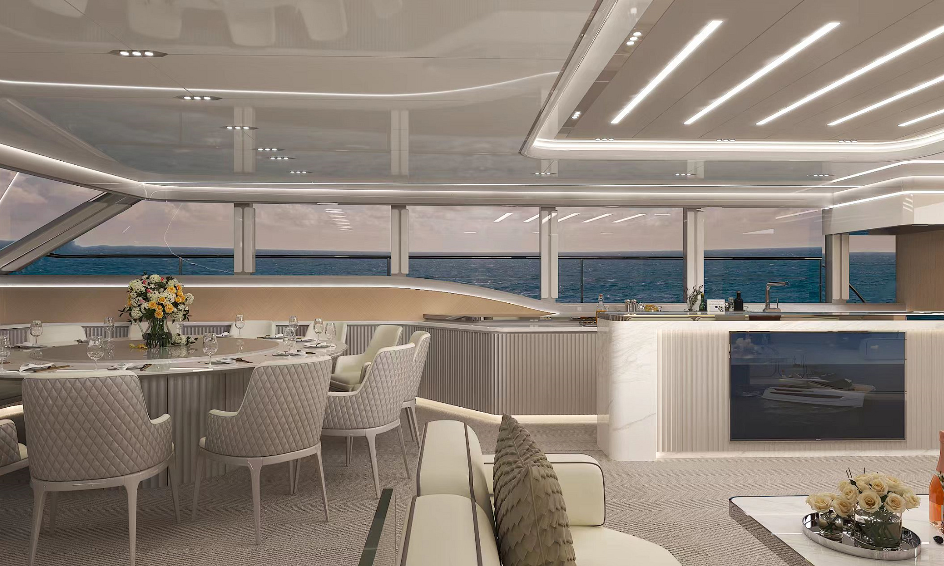 曲面飛橋甲板獨(dú)具匠心,通過獨(dú)特的弧線形設(shè)計(jì)拓寬船側(cè)窗戶面積,讓自然光線如瀑布般傾瀉而入,不僅大幅提升室內(nèi)采光效果,更賦予船內(nèi)開闊通透的視覺感受。