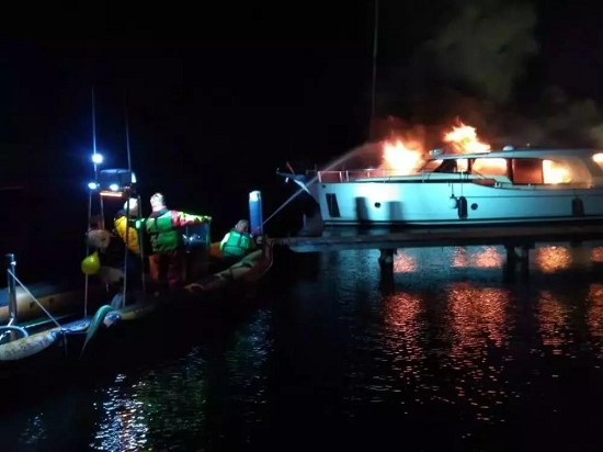 這是一艘停泊在碼頭上的電動游艇,由于船用電池,給消防隊的滅火工作帶來困難。